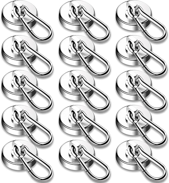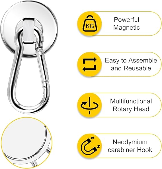 The magnetic hooks are made of high-quality neodymium magnet, with strong magnetic force. It can reach 110lbs tension when suspended vertically and 35lbs tension when suspended horizontally Magnetic Carabiner hooks are easy to remove, they would be great in any small space to aid storage and easy accessibility, and these magnetic hooks fit in anywhere and serve a purpose that cannot be duplicated.  These magnetic rotating hooks are plated with Ni+Cu+Ni triple protective layer, which is corrosion and rust resistant, and with the stainless steel carabiner, our hooks are great for outdoor long time use.